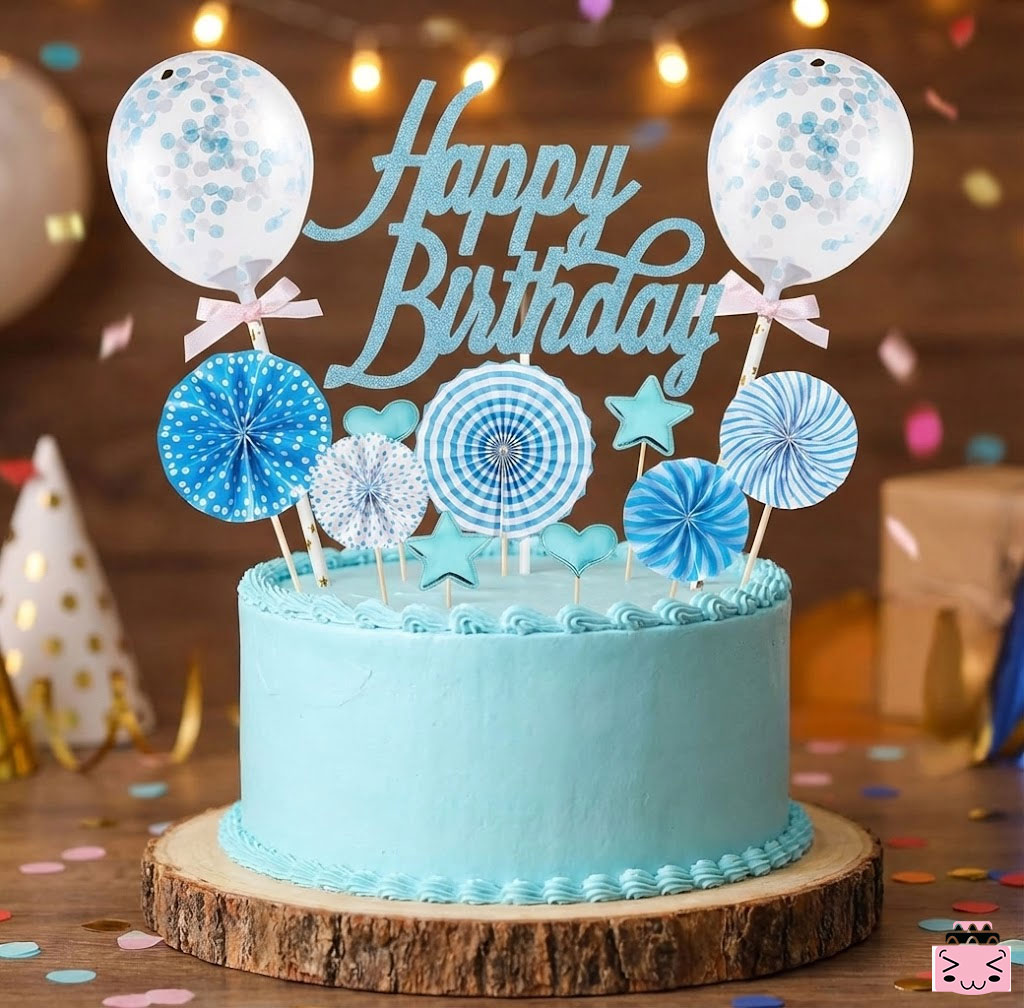 Popoln komplet za čudovito okrasitev rojstnodnevne torte v modrih odtenkih.