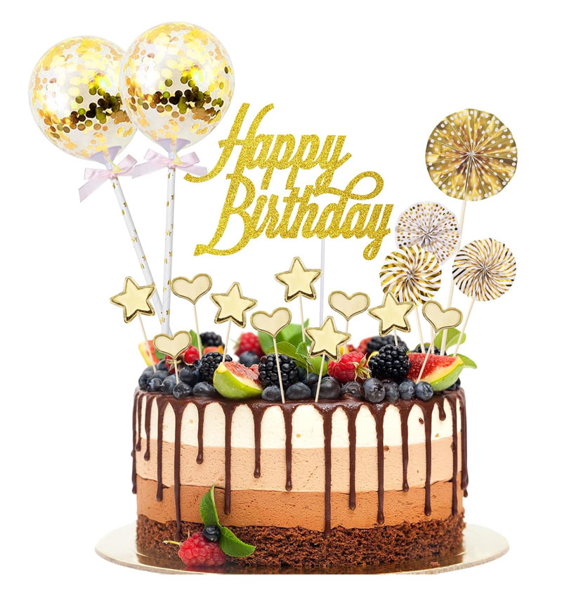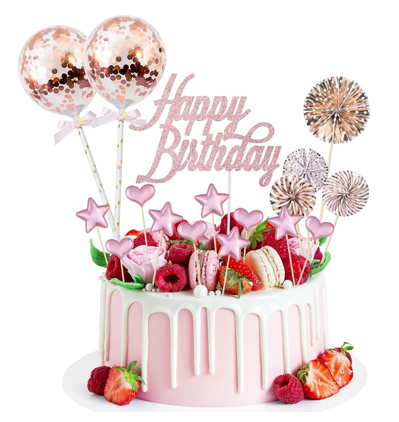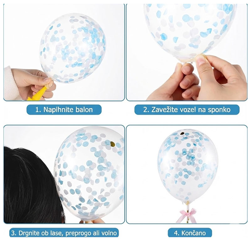 Vsebina paketa (17 kosov): 1x bleščeč napis “Happy Birthday”, 2x balon s konfeti, 4x papirnate pahljače, 5x zvezdice in 5x srčki.